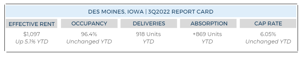 Nobody likes rising interest rates, but it is having a positive impact on apartment fundamentals. According to the Mortgage Bankers Association, mortgage applications to purchase a home are down approximately forty percent from this time last year. Mortgage rates have more than doubled in the past year as the Federal Reserve pushed ahead with its unprecedented campaign of hiking interest rates to subdue inflation. If people can’t afford to purchase homes because of expensive mortgage payments, they will continue to rent. The larger renter pool helps the demand side of the equation. With supply relatively flat, increased demand will again place upward pressure on rental rates, resulting in higher cash flows and potentially higher real estate values. By way of example, the overall fundamentals in Des Moines, Iowa, have remained strong this year, which has attracted the eye of institutional capital.
