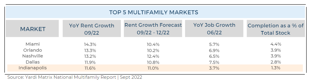 Let’s look at the current supply/demand imbalance in the multifamily asset class. The U.S. faces a pressing need to build 4.3 million new apartments by 2035, according to a recent study commissioned by the National Apartment Association (NAA) and the National Multifamily Housing Council (NMHC). The 4.3 million apartment homes needed include an existing 600,000 apartment home deficit because of underbuilding during the 2008 financial crisis. More demand than supply places upward pressure on rents, resulting in higher cash flows and potentially higher values. Indianapolis, Indiana, is a testament to a market where there is a supply/demand imbalance.