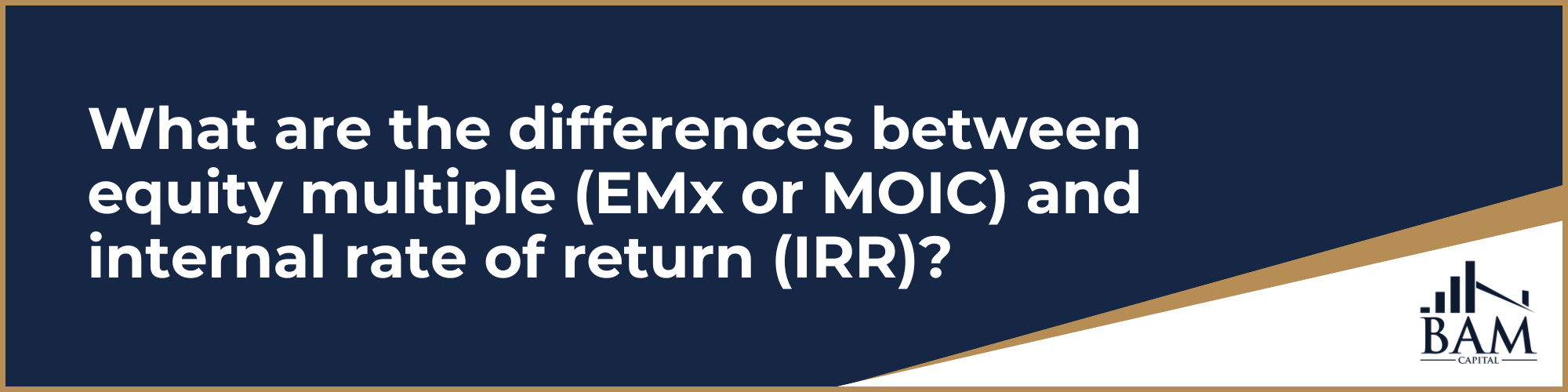 Investors often ask about the difference between an internal rate of return (IRR) and an equity multiple (EMx), which is the multiple on invested capital (MOIC). Multifamily real estate has a standardized method for assessing and comparing an investment’s financial performance, associated risks, and potential returns through quantitative metrics. Performance indicators, such as IRR and equity multiple (EMx or MOIC), enable data-driven decision-making when measuring a property’s profitability, rather than relying on qualitative information.