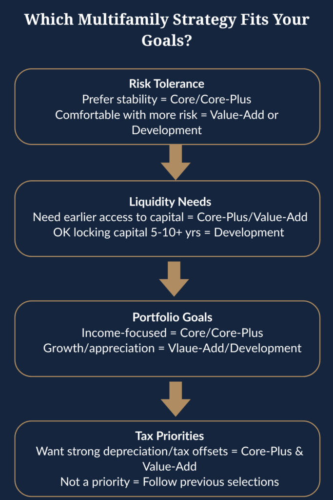 Before choosing a multifamily strategy, think about what you’re trying to achieve, how much risk and control you’re comfortable with, your liquidity needs, and your overall portfolio goals.