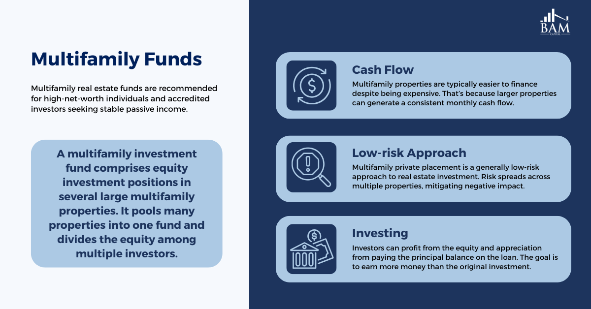 A multifamily investment fund comprises equity investment positions in several large multifamily properties. It pools many properties into one fund and divides the equity among multiple investors. [3]
