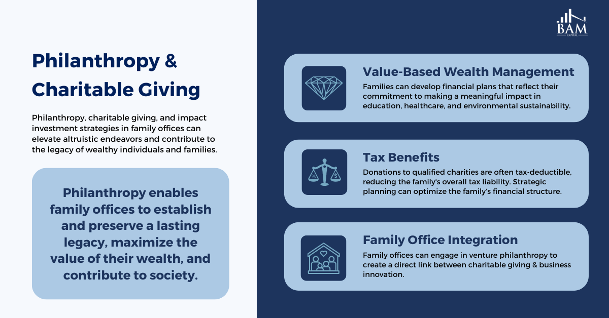 Family offices incorporate philanthropy and charitable giving into their strategy because they benefit society while contributing to intelligent financial planning.