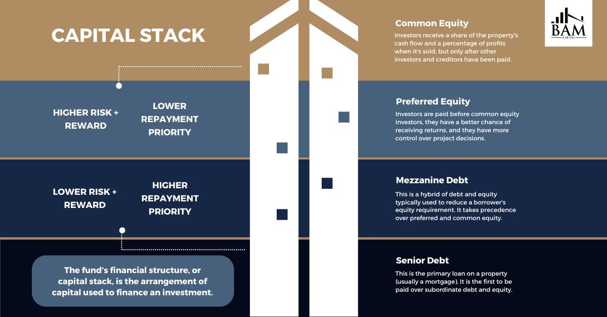 The capital stack in private placement represents the financial structure of a commercial real estate deal. It visualizes the various types of capital used to finance the project, showing the order in which investors and lenders are repaid, as well as the risk and reward associated with each layer of the capital stack. [9]