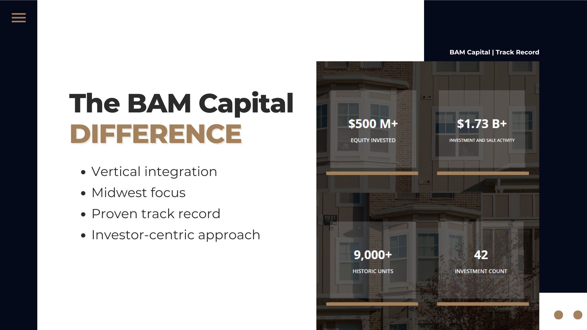 BAM Capital partners with accredited investors who want to enjoy passive income and all the other benefits of multifamily private placement. As the private equity arm of The BAM Companies, BAM Capital has been focusing on buying the most profitable assets and staying disciplined in its investment thesis. BAM Capital’s investment strategy aims to create forced appreciation while mitigating investor risk. To date, the brand has successfully managed over $1.7 billion in assets across ~9,000 apartment units.