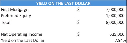 It’s an underrated but essential metric. The concept of “yield on the last dollar” or “last dollar basis” in real estate refers to the total capitalization of a project, including all financing layers (such as senior debt, preferred equity, etc.) or a specific layer’s position within the capital stack. The “last dollar yield” is often discussed with the underwriting of preferred equity investments. Preferred equity sits above the common equity in the capital stack but is subordinate to the senior debt. Therefore, the “last dollar” refers to the preferred equity’s highest loan-to-value or the total capitalization achieved when including the preferred equity alongside the senior debt.
