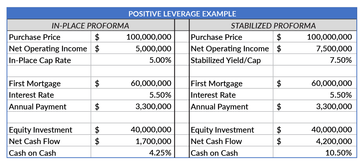 Capitalization Rate (Cap Rate): It’s the owner’s last dollar and the first loss position of the real estate capital stack. It’s calculated by dividing the property’s net operating income (NOI) by its current market value. A $100 million acquisition with an NOI of $5 million results in a 5.0% capitalization rate. Cap rates help investors compare different investment opportunities and assess the potential risks and rewards.