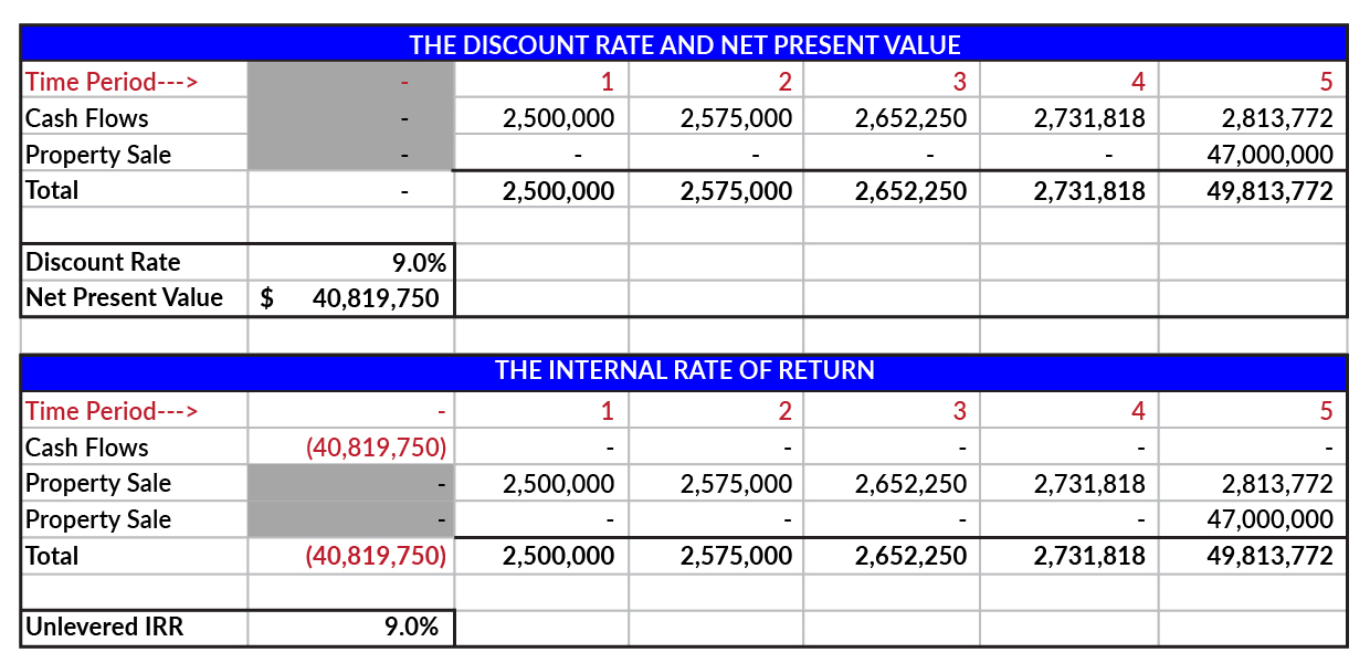 Discount Rate: The discount rate is a crucial factor in determining the present value of future cash flows and assessing the investment’s overall worth. It reflects the perceived risk and expected return associated with an investment. This rate is used to discount those future cash flows to their present value, allowing for comparison with other investment options. It’s also the investor’s unlevered internal rate of return (IRR) and how you solve the purchase price on a potential transaction with no pricing guidance.