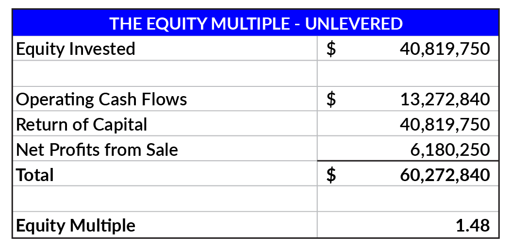 Equity Multiple (EMx): The equity multiple is a key metric that measures the total return on an investment relative to the initial equity invested. It includes cash flows during the holding period, a return of equity, and a return on equity.