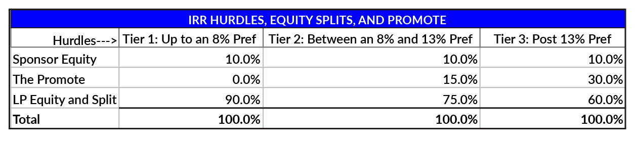 Promote or Carried Interest: It represents a disproportionate share of profits that a real estate sponsor (the individual or entity managing the investment) receives above their initial investment, typically after investors have achieved an agreed-upon return. Similar to the equity split, the promote will vary and is deal-specific, depending on the risk profile of the investment.