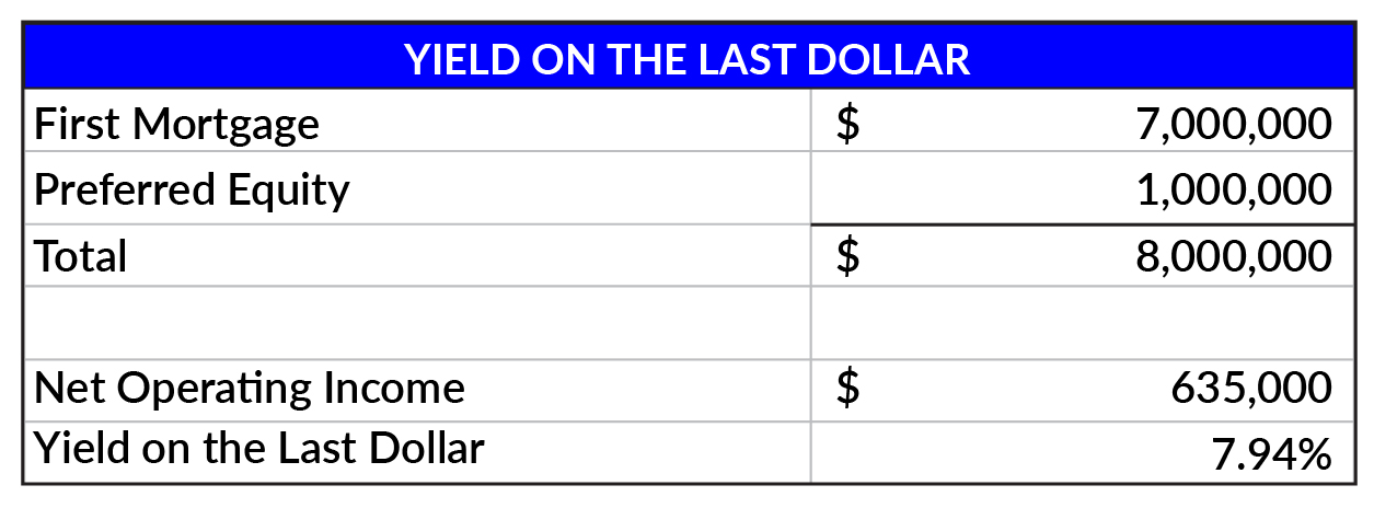 Last Dollar Basis: The “last dollar yield” is often discussed in the context of underwriting preferred equity investments. Therefore, the “last dollar” refers to the preferred equity’s highest loan-to-value or the total capitalization achieved when including the preferred equity alongside the senior debt.