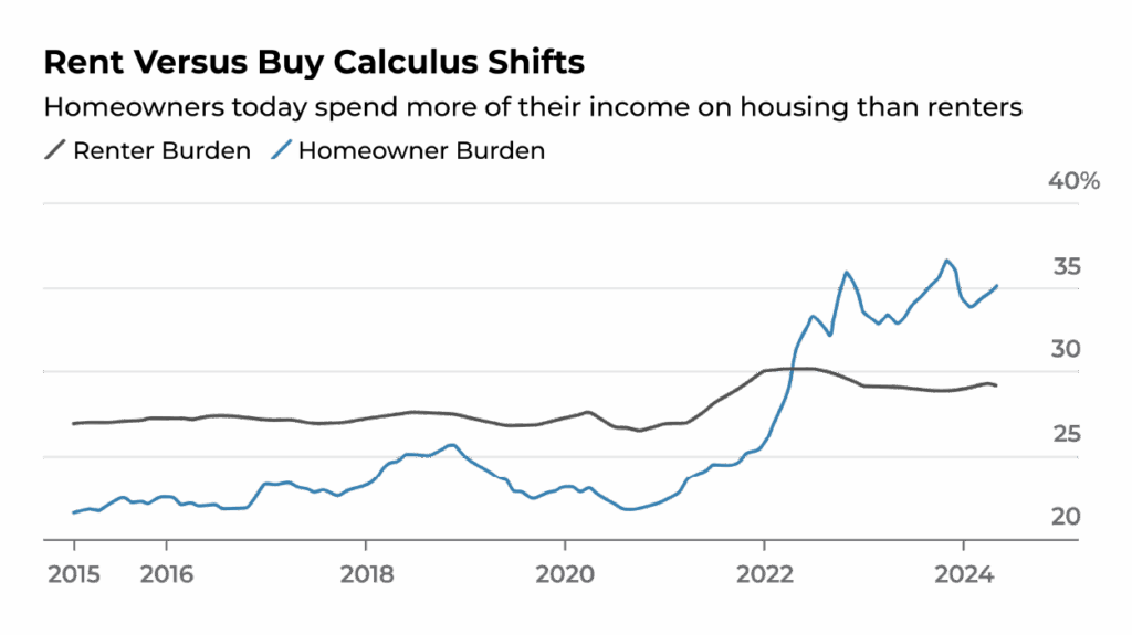 Note: Homeowner burden is the share of income spent on housing costs including mortgage, property taxes and homeowners insurance for the typical US home. Rent burden is the share of income spent on market rate asking rents of typical unit.